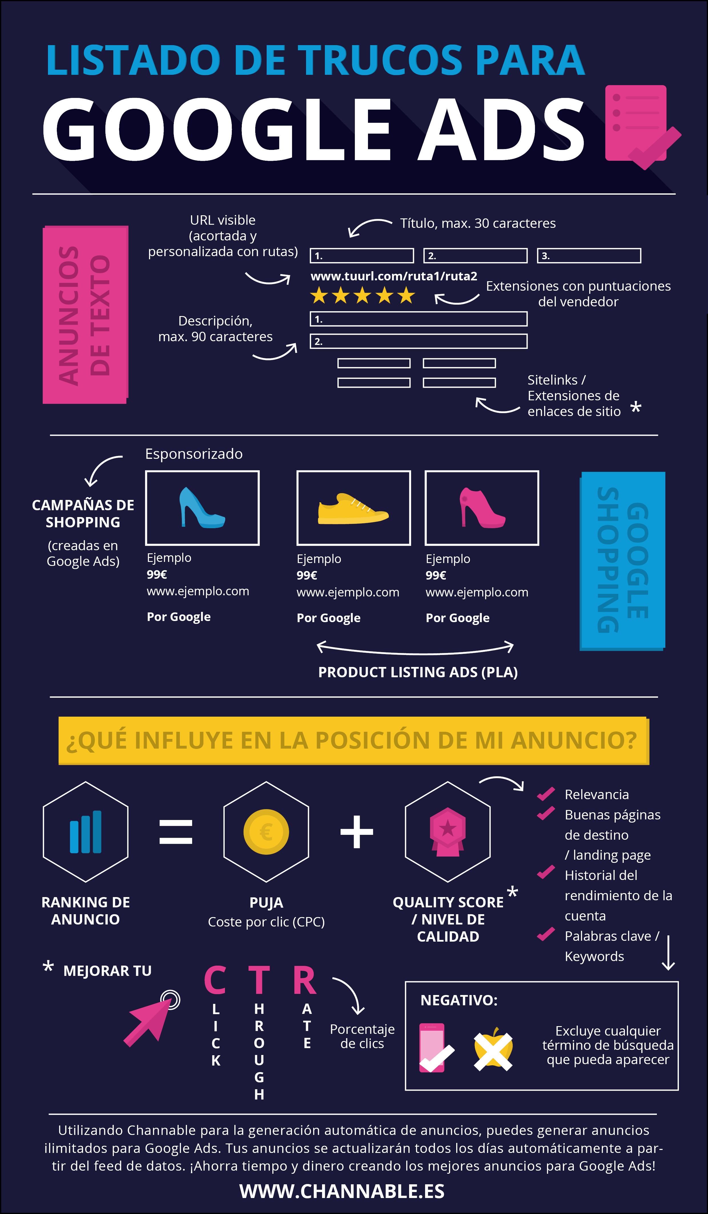 Siendo el mayor motor de búsqueda del mundo, los anuncios de Google atraen negocios de todo tipo. Sin embargo, para los inexpertos, Google Ads puede ser muy difícil de entender. Para facilitarte la vida, Channable ha recopilado la terminología más importante de Google Ads en una infografía.