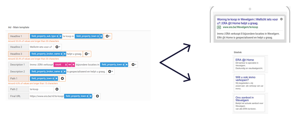 Vanwege de enorme grootte van het bedrijf en de altijd veranderde vastgoedmarkt, was het een grote uitdaging om ERA te helpen met hun promotie. Matthias legt uit: “meer dan 40 individuele nieuwe virtuele klanten hebben wij in een account moeten onderbrengen. Elke individuele klant had hierbij zijn eigen budgetten, ROAS doelen, en KPI-frameworks. Samen bieden deze klanten meer dan 27.000 dynamisch vastgoed items aan op vijf kanalen en, omdat het België is, wordt alles tweetalig aangeboden (Nederlands & Frans).”